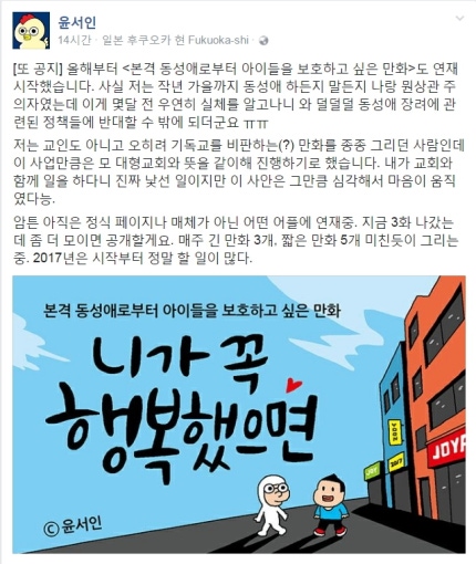 윤서인 작가는 24일 자신의 페이스북에 “올해부터 ‘본격 동성애로부터 아이들을 보호하고 싶은 만화’ 연재를 시작했다”고 전했다. 그는 “나는 교인도 아니고 오히려 기독교를 비판하는 만화를 종종 그리던 사람인데 이 사업만큼은 모 대형교회와 뜻을 같이해 진행하기로 했다. 내가 교회와 함께 일을 하다니 진짜 낯선 일이지만 이 사안은 그만큼 심각해서 마음이 움직였다”고 밝혔다. 이어 “아직은 정식 페이지나 매체가 아닌 어떤 어플에 연재 중. 매주 긴 만화 3개, 짧은 만화 5개 미친 듯이 그리는 중”이라고 덧붙였다.